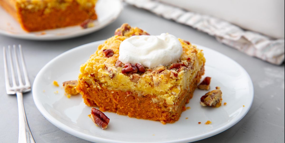 Butter a 9 x 13 bakeware. 1525 ounces yellow cake mix 15 ounces pumpkin puree 2 tablespoons brown sugar 1 teaspoon pumpkin pie spice. Transfer the cake batter to the prepared baking dish and.